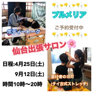 今年4/25(土)と9/12(土)に、プルメリアサロンが仙台出張致します。 仙台市内で.「怠け者のヨガ(タイ古式ストレッチ)」と「ボディート...