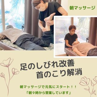 足の疲れやしびれをスッキリ解消! ガチガチに硬くなった首のコリも優しくほぐします♬ 「朝マッサージ」はお得なチケット制で平日朝9:00から施...