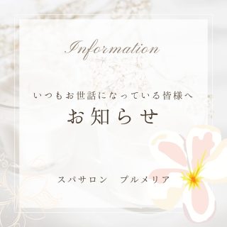 平素は、スパサロンプルメリアをご利用いただきまして 誠にありがとうございます。 突然のお知らせではございますが 4月25日(火)をもちまして...